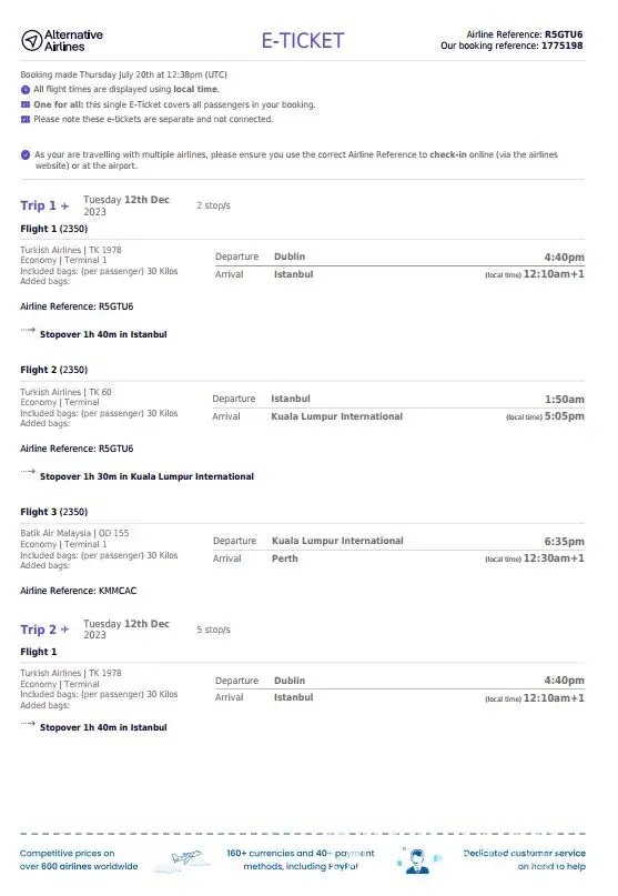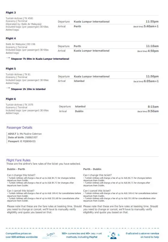 Now this flight was offered as a full ticket, however upon booking I was told my mom would have to check out and back in to transfer from Kuala lumper to Perth (with only one hour availability), and that was my problem apparently, so I paid to change to have 7 hours for her to do this. Thats fine it was done and organised.