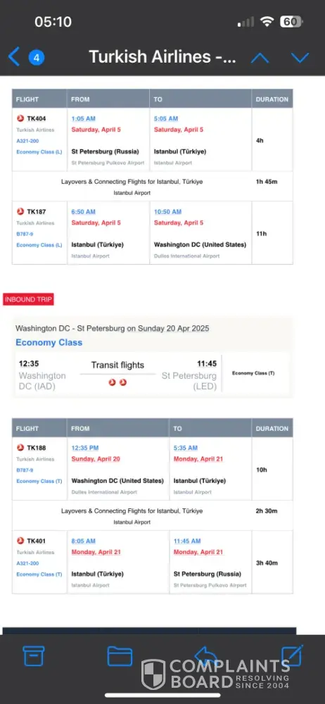 Hello, I arrived at the Washington IAD airport on 5.04.25​ FLight number TK 404 with the connecting flight TK 187 The luggage from that flight according to the info desk was on the carousel 21. But my luggage wasn’t there. The airport clerk checked the information regarding the luggage and he said it indicated that my bag arrived. Anyway, I did...