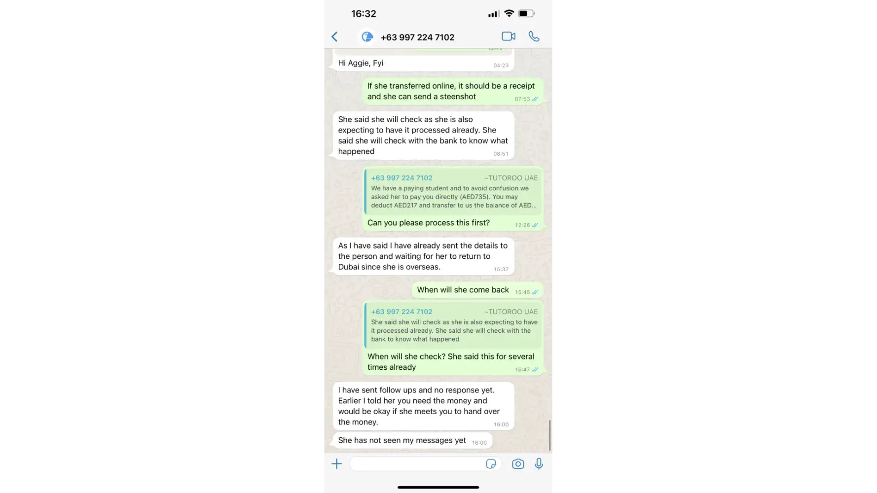I asked for the rest of the money, Tutoroo said will ask another student to pay me as soon as that student come back to Dubai, but don't know when.