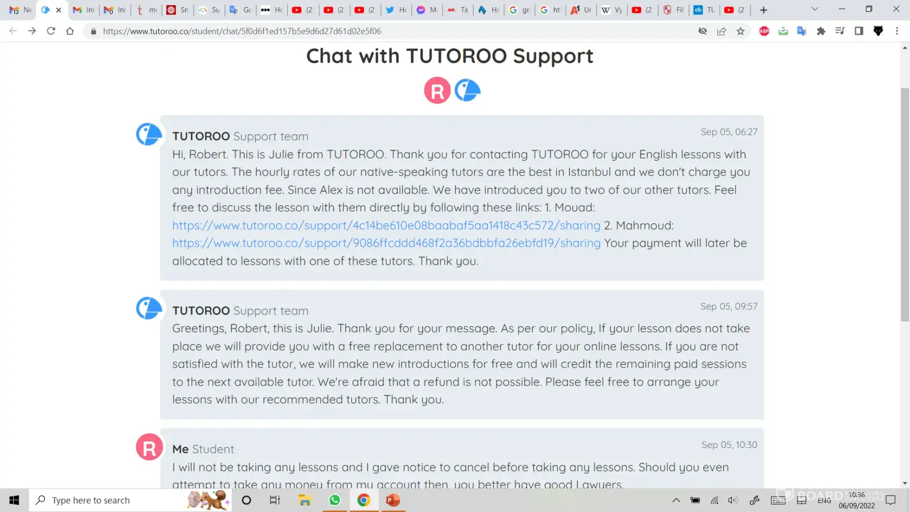 Due to not being able to achieve any of my specific requests and understanding that I was not getting any support on a Sunday, I wrote to Tutoroo that evening informing them of my wish to cancel any agreement for tuition and that they should refund any monies withdrawn.
