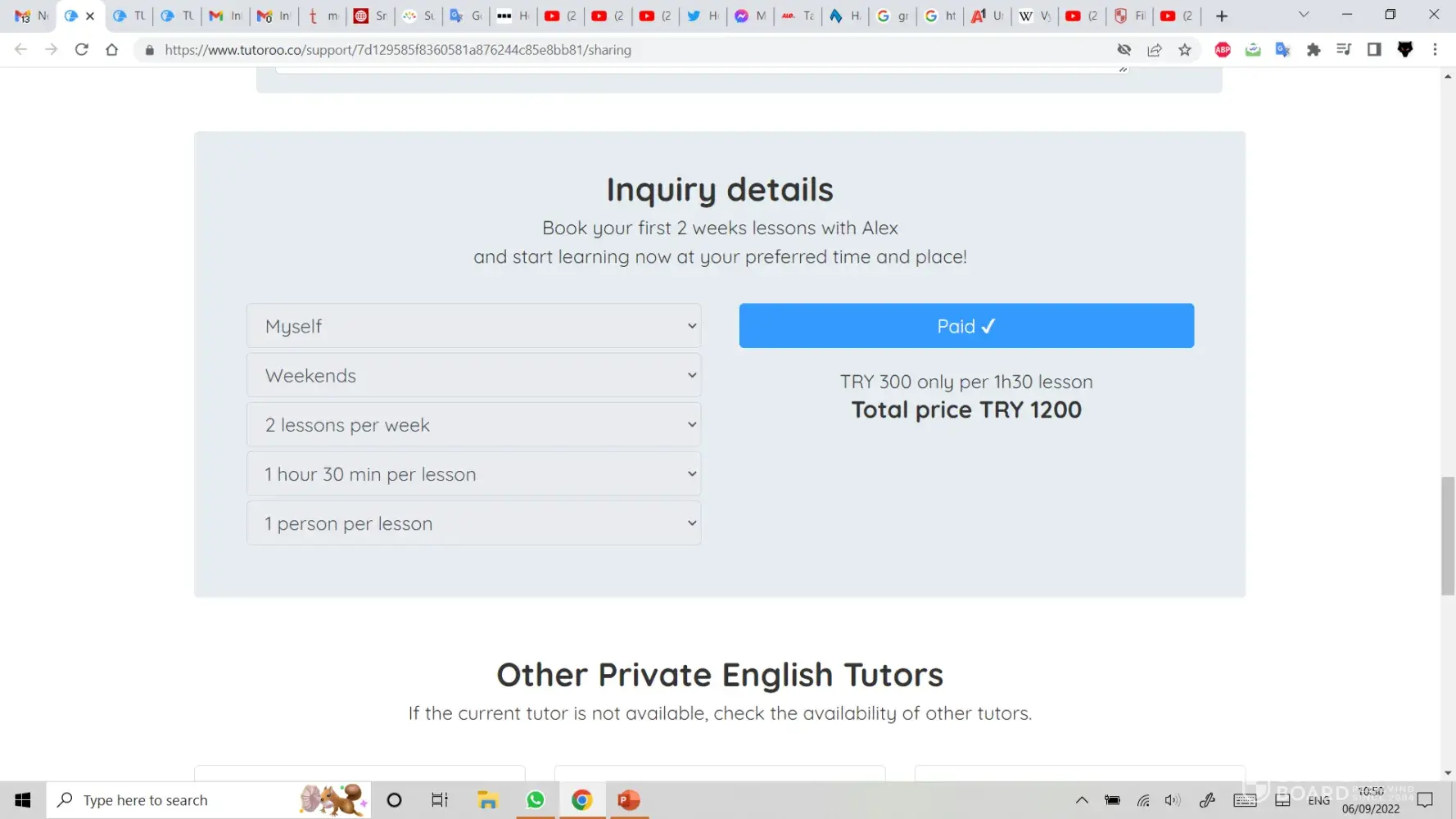 I found a tutor I liked that was close to where I live and charged €15 for 1 and a half hours per lesson. I navigated to the payment section to lock in my lessons and the website suggested that I book 2 lessons for 2 weeks, making it €60 total. I booked the teacher and was very excited to hear back!