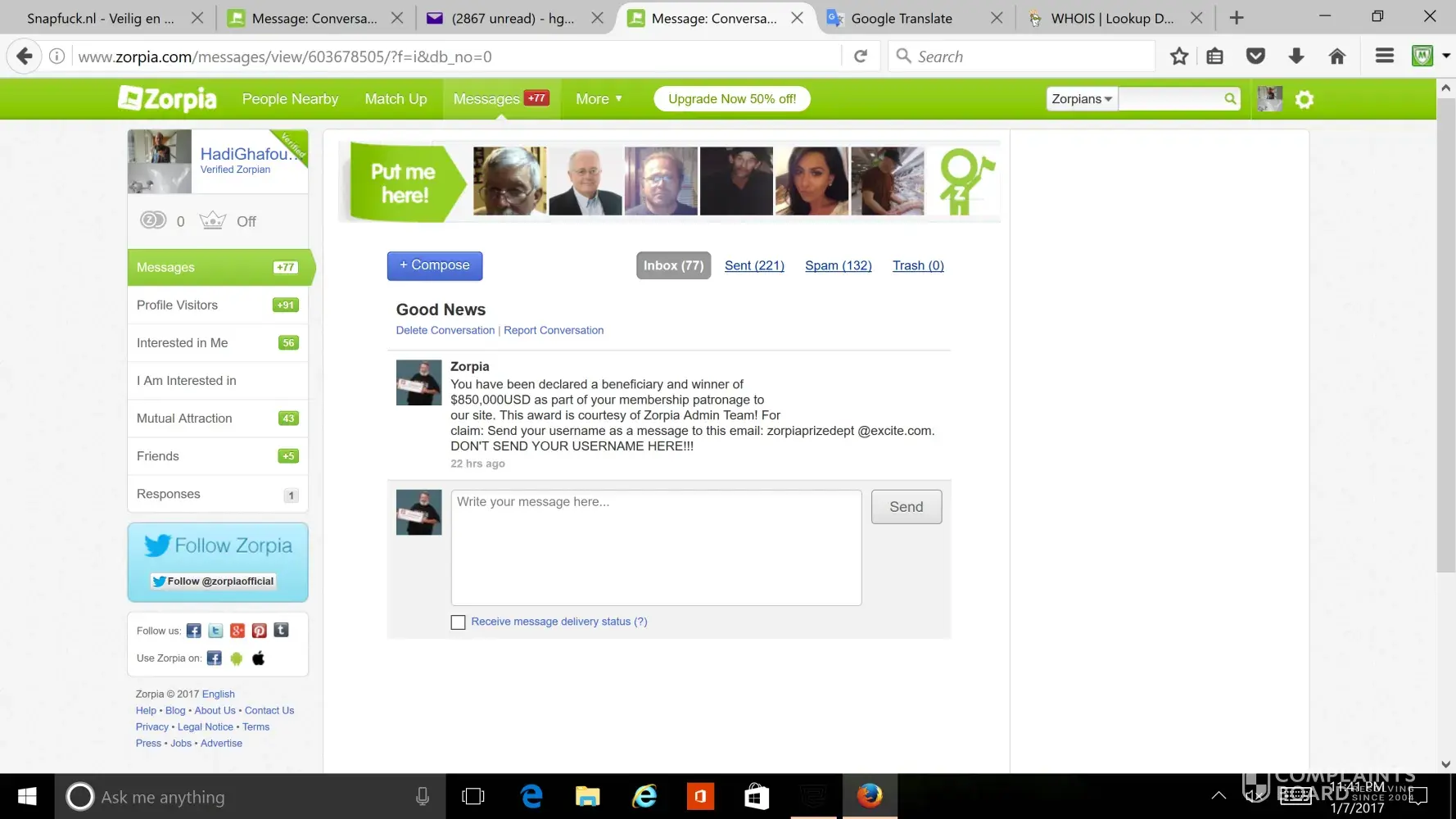 I recently received a email from your company Zorpia saying that I won $850.000.000 and to contact your prize department and I did and I haven't heard nothing else from you, what's really going on?