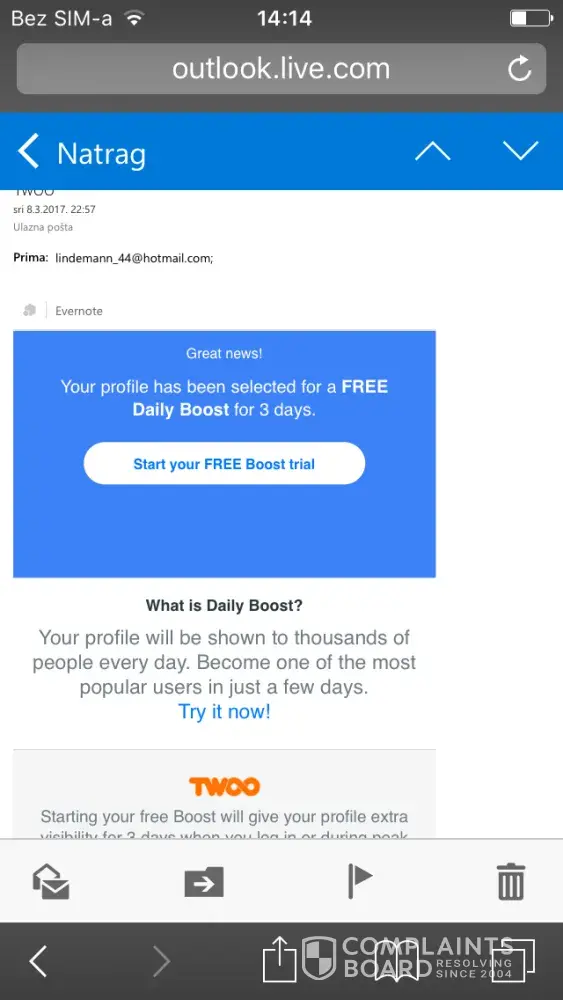 The spam originates from email lists that are not created by friends and contacts of legitimate users. My email address was an invitation from someone I don't know... so clearly Twoo pay people to mine email lists from wherever they can find email addresses online and blanket spam them under the pretence of an "invite". This is not consent. In the EU this is illegal. Twoo need to stand up and have a single option to unsubscribe via email address, without sign in, and for complaints to be directed to a proper email address for Twoo - not a catch all info@. Untill they do us Aleksadra can shut up with her silly statements of "feedback from our users is important". Maybe prove to us she has our consent first?