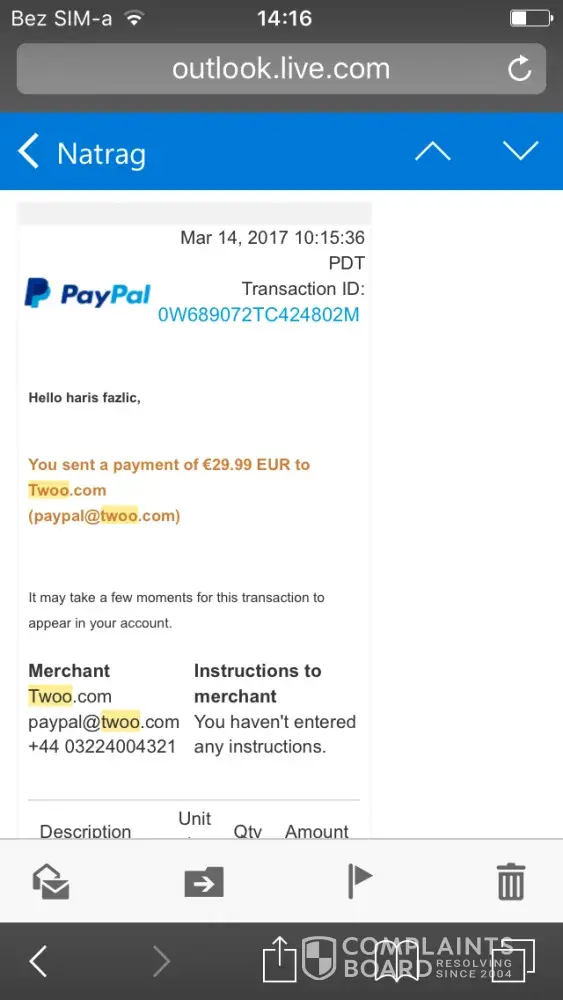 unauthorized payment $92.99 for 3 months of twoo boost pack on my paypal