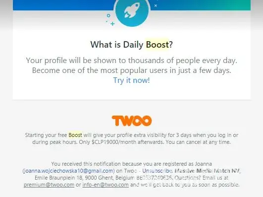 The deliberate "unsubscribe by signing up" is a scam to get consent. The "email info@" is also a scam to coroborate our email. Aleksandras empty offers ignore the long term evidence of victims that Twoo is out to scam to increase corporate value. Twoo's business model is contrary to the rules of GDPR. Twoo's excuse that they have our consent is a lie. They can not provide any evidence they have our explicit consent nor that they mined our email address legitimately.