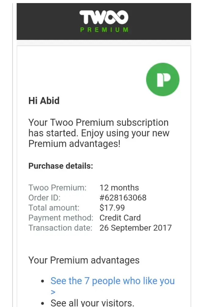 You have sent a payment of 15.00 CHF to Twoo.com ([protected]@twoo.com)