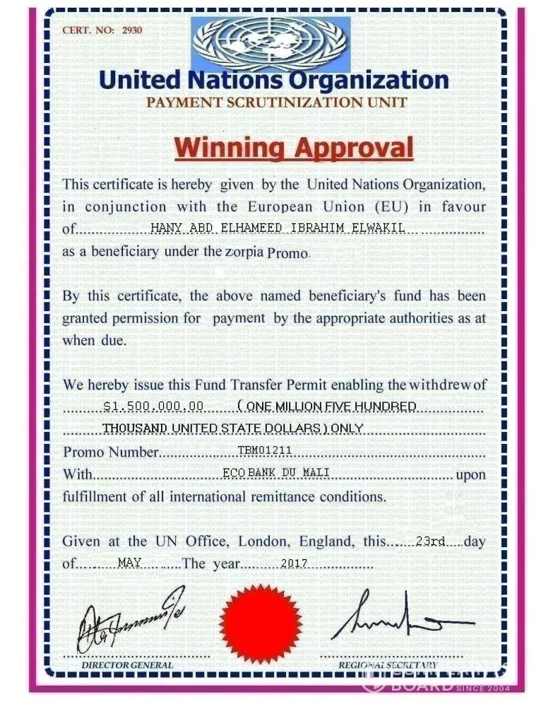 Dear Mr Hany congratulations once again, please we are very sorry for the long silent just right moment we received a call from the bank this morning that your International cheque is successful and we have brought it right now from bank together with the approval certificate document and also decided to scan the photo copies and show to you so that you will see it for your confirmation.