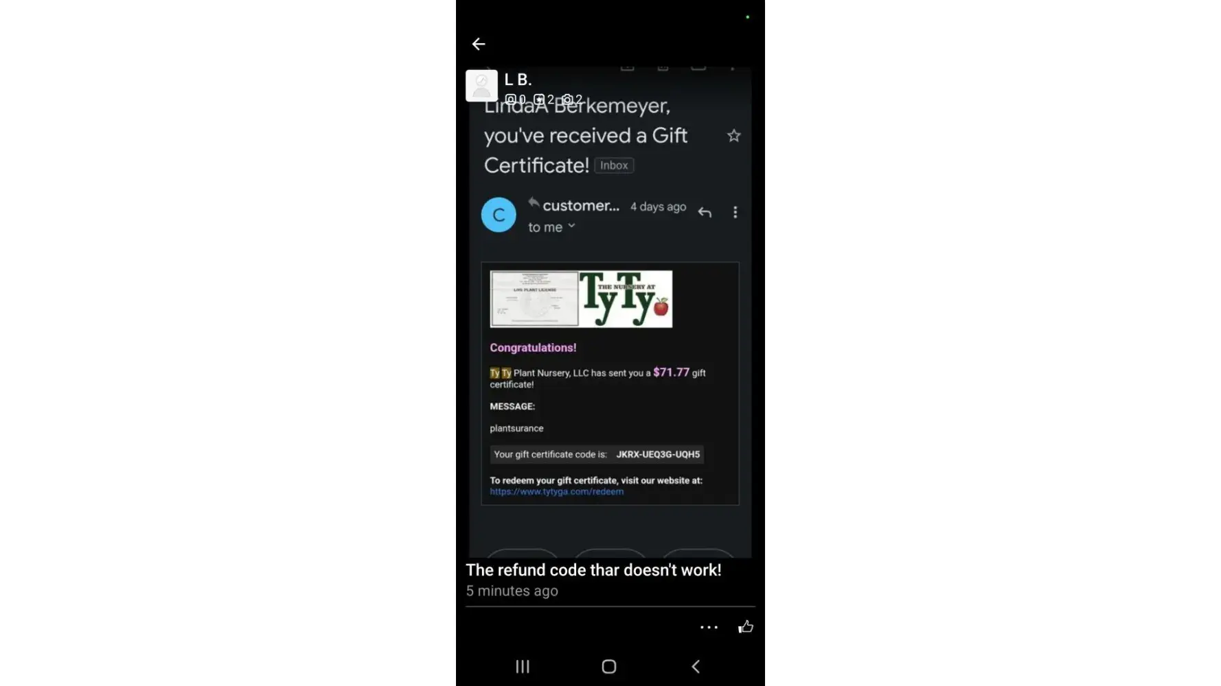 Once again Ty Ty Plant Nursery continues to cheat the consumer. I have tried and tried to resolve issues with their less than desirable products showing up dead on my doorstep usually due to their inability to pack and ship appropriately. Now, they want 22 bucks plus tax top ship something (garbage) to my house that may take weeks or months to show. 1. I want refund of original $99.00 purchase since the replacement was dead on arrival (DOA). 2. We decide that I would accept $69 they gave me $59 and I let it go and now this. (see below). 3. Their claims that they are 20% cheaper than retail is preposterous since I buy cheaper and healthier via Home Depot. 4. They have inferior products at ridiculous prices and do not honor their agreements. 5. I am sooooooooooooo done with their scamming techniques and want full ($99.00), now! My Gift Certificate balance You currently have a gift certificate balance of $69.75. This balance will be automatically applied to any future purchases you make. Here are the top 10 most recent purchases using your gift certificates: Order date Order# Gift Card ID Original Gift Card Value Amount Used On This Order 3/8/2023 3:01:00 PM 430381 CNQSM4D8XKN2K $99.75 $69.75 Buy Your Plants and Trees From Ty Ty Nursery (tytyga.com) Buy Your Plants and Trees From Ty Ty Nursery Buy your plants and trees online for 33% less than big box stores and gardens centers. Grow your fruit trees, berry plants, nut tree, and berry plants at home for savings at the grocery store. Buy hardy palm trees and bamboo plants at low prices for fast tropical savings. Free 1-year guarantee on all plants. www.tytyga.com Promo Code Subtotal$59.75 Shipping$26.02 Estimated Tax$6.87 Store Credit$69.75 Total$22.89 "A teacher is like a candle...it consumes itself lighting the way for others." Charles F. Surman, III, Major,USAF (retired) “Whatever you are, be a good one.†“Be yourself; everyone else is already taken.†[protected]@hotmail.com