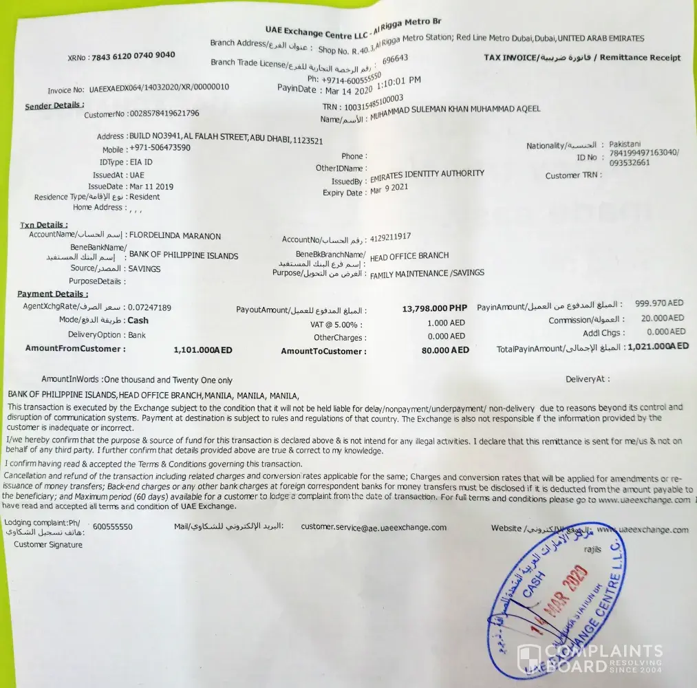 I sent money to my country on 14 March via UAE exchange but till today its not received in my country.