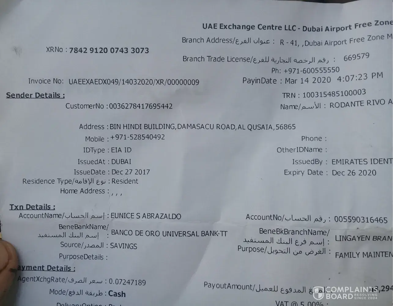 Attached UAE Exchange receipt for your reference