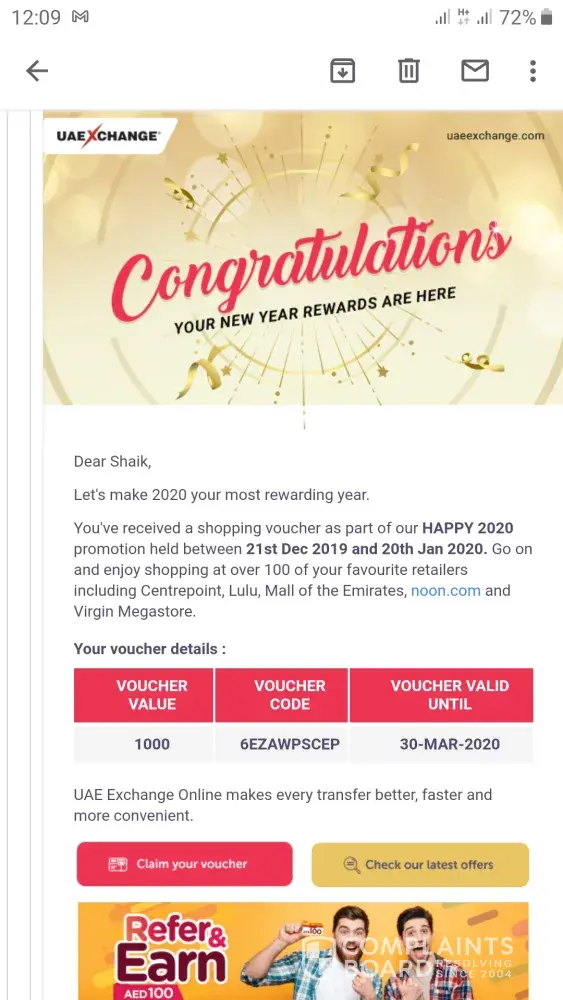 I had got a voucher for 1000dhs to be utilised till March 2020. Due to covid 19 pandemic I could not go back to UAE and my voucher expired. I am contacting uae exchange for extending the validity of the voucher but no response received till date.