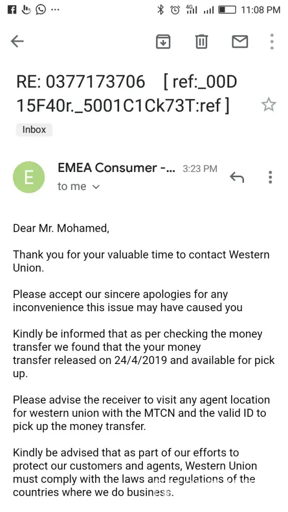 I been send TCN westerunion at 14april2019 the transfer hold by westernunion