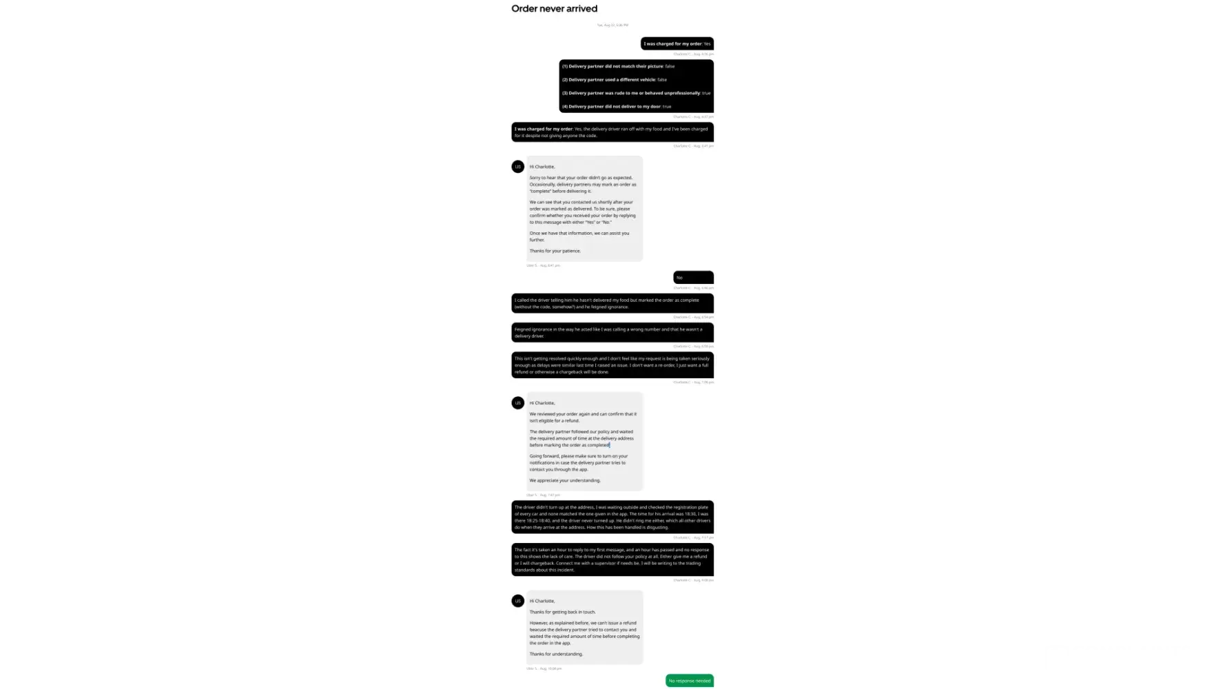 At 10:08pm they replied, saying "However, as explained before, we can’t issue a refund beacuse the delivery partner tried to contact you and waited the required amount of time before completing the order in the app."