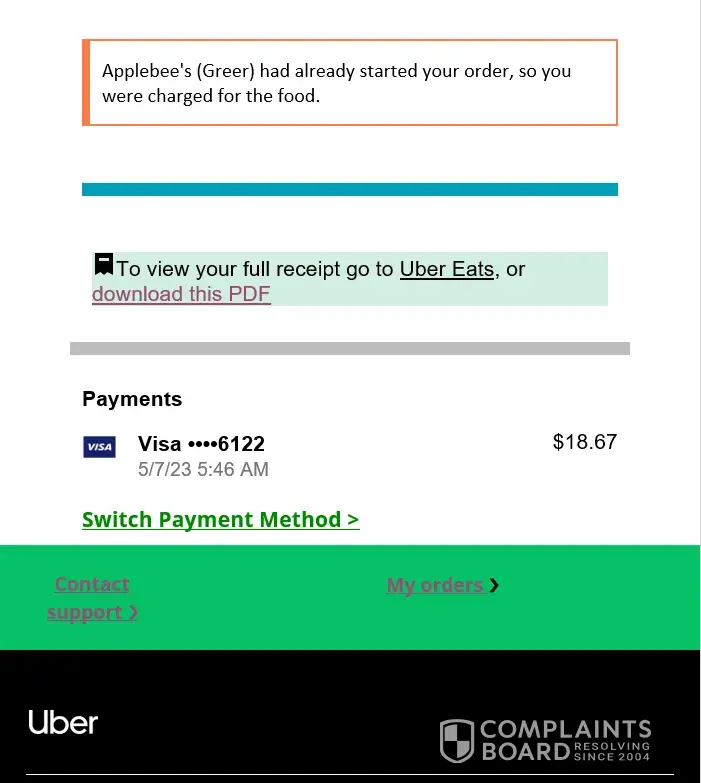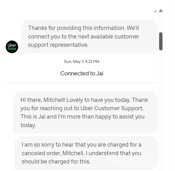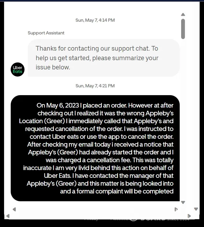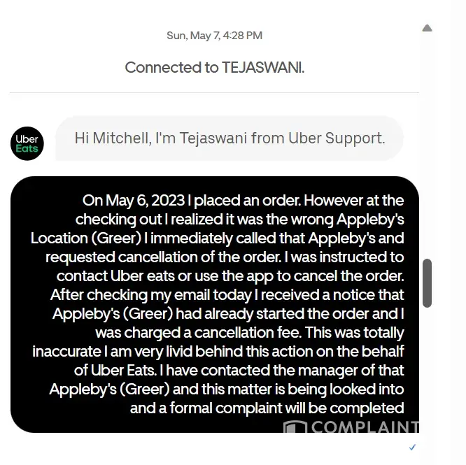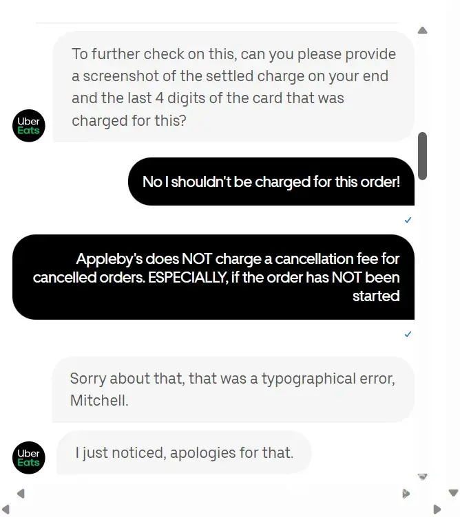 Received an email from uber eats that stated I was being charged for a cancelled order because the merchant had already started the order, untrue I immediately called the merchant to let them know I placed the order at the wrong location and do not proceed with the order. I was instructed to contact uber eats or use the app to cancel. Which I immediately did. Today I found a notice in my email of a cancellation charge for $18.67. I contacted the merchant appleby's greer, sc location and spoke to the manager kenny. He told me that they do not charge cancellation fees on product, even if the food is prepared. It's just not policy. I then contacted uber eats. Attached are the snaps of the (so-called) support chat. Chats are sequentially labeled from 72-84 disregard missing snaps as they are unrelated to these.