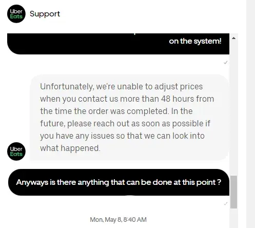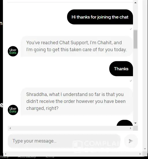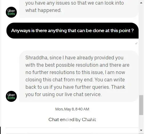 After multiple attempts, one of your customer service agents informed me that the transaction doesn't reflect on the system and that I would be transferred to another department to address the issue. She said I will be receiving a follow up email regarding the issue. However, I never received an email or call regarding the matter. While drafting this email, I attempted to locate the chat on my UberEats app, but was unable to find it.