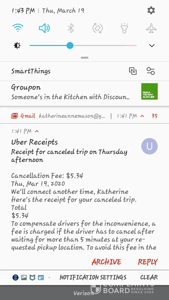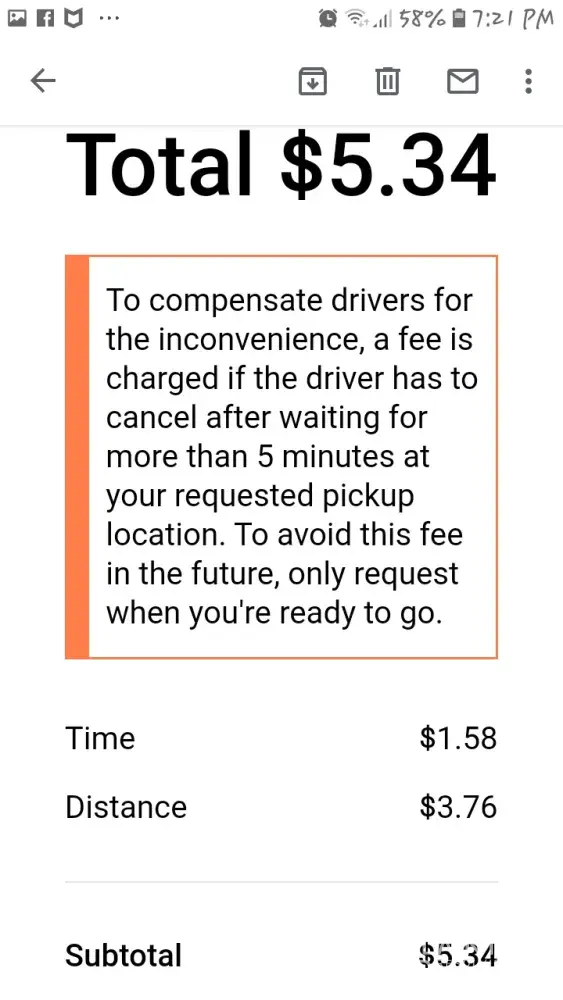 Was charged a fee of over $5.34 for driver cancellation