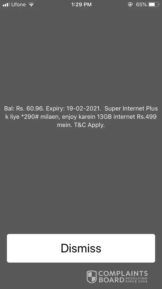I just joined Ufone vide cell no. [protected] in Feb, 2021 and charged super card of Rs.499/- through easy paisa account and acknowledged through ufone SMS message received that the load valid upto 18/03/2021 but after few days balance expired and phone could not operative.