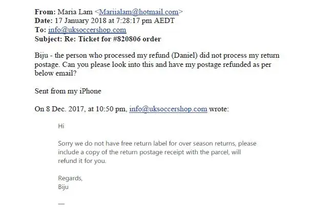 In the return envelope I included the email trail detailing the postage refund and also my receipt for postage.