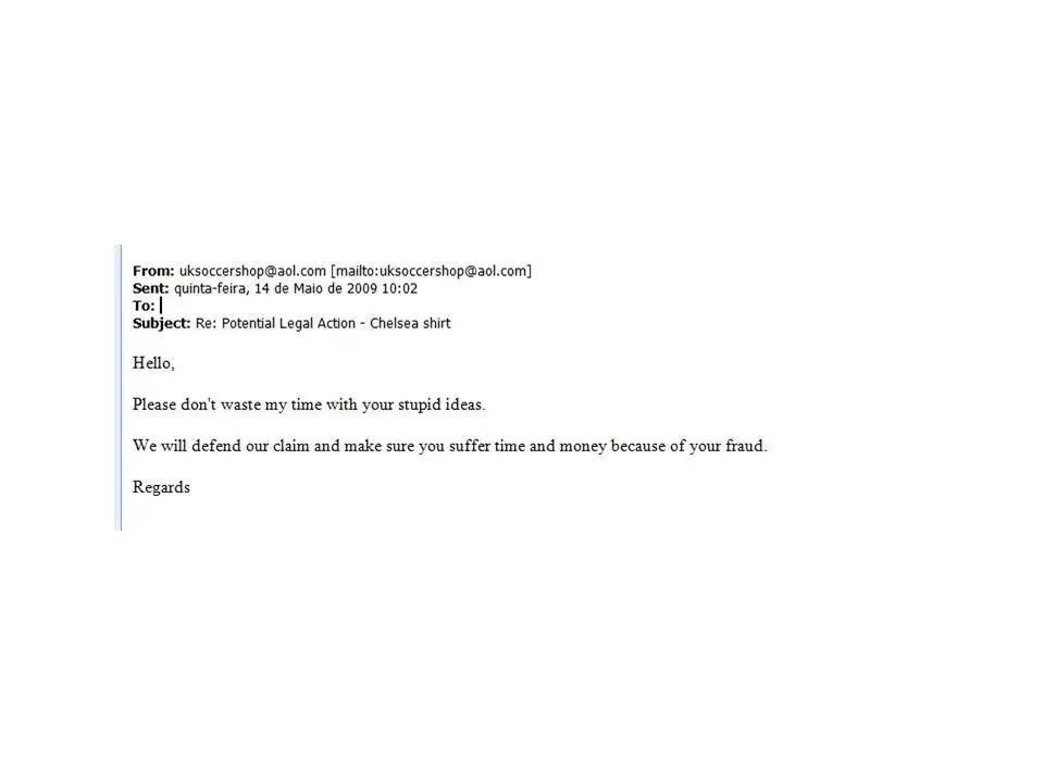 I made an online purchase from UKsoccershop.com on 6/5/2013 for a Tottenham kit. I am in Los Angeles, California and I expected the shipment to arrive in a relatively short time, not my first time buying from the UK. Two, three, four weeks went by without receiving my order. Their site specifically would state not to contact them within 45 days requesting a status. On the 45th day, I received an email from a “Biju Peter”, using [protected]@uksoccershop.com as their email address. He said that he was checking on the status of my order and asked me to check back with him a few days later. This went on for another 20 days, with no resolution.