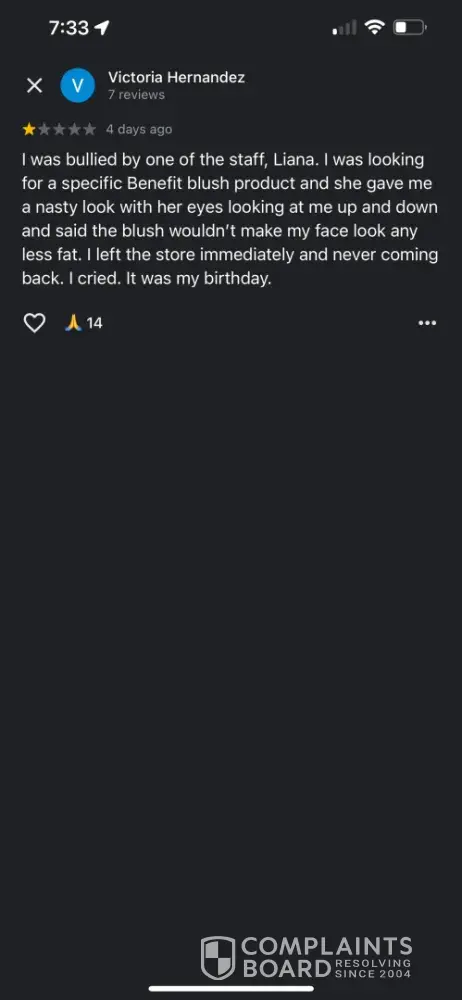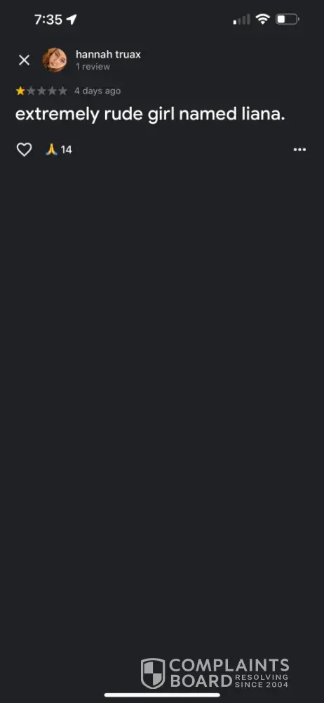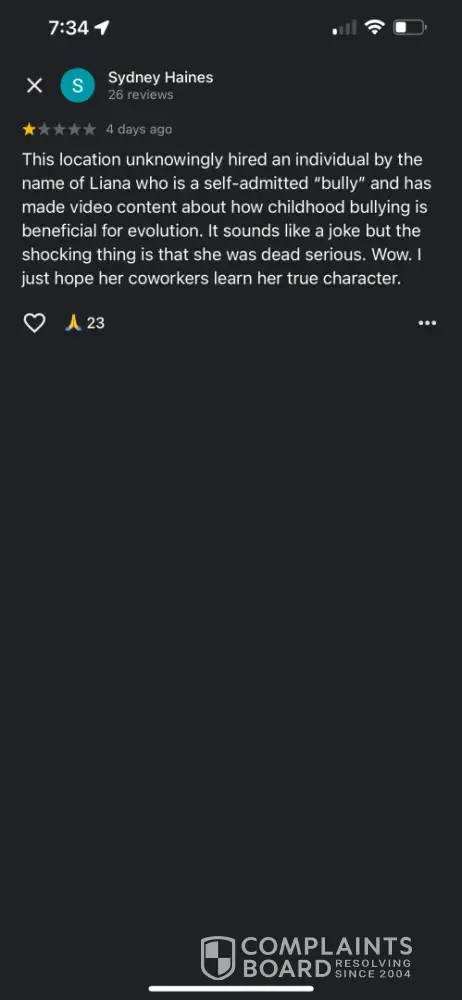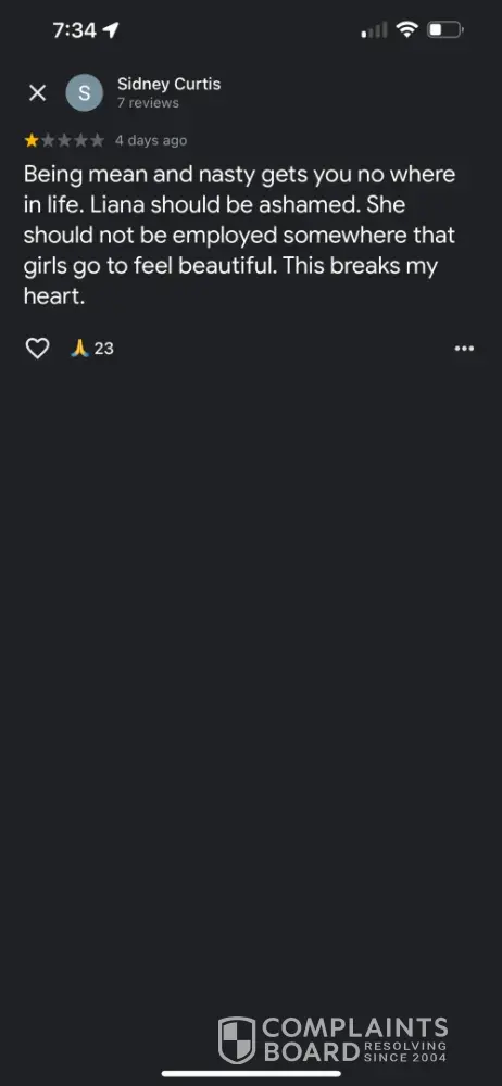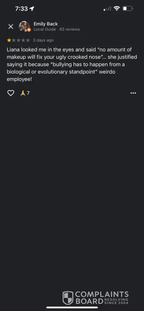 Liana at this location has been documented on google reviews within the past 4 days with numerous complaints about her bullying. She is bullying women for their appearances. 2 days ago: “Liana is the worst her attitude is not giving†3 days ago: “Liana looked me in the eyes and said ‘no amount of makeup will fix your ugly crooked nose’…she...