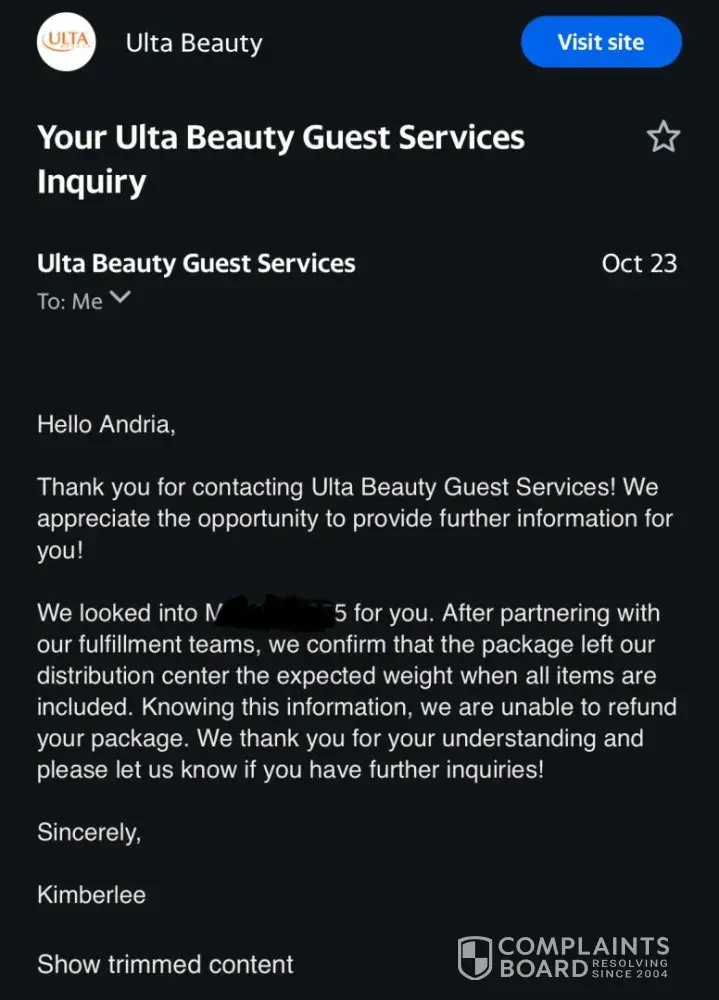 - While Ulta Beauty has a high level of trust, our investigation has revealed that the company's complaint resolution process is inadequate and ineffective. As a result, only 11% of 444 complaints are resolved. The support team may have poor customer service skills, lack of training, or not be well-equipped to handle customer complaints.