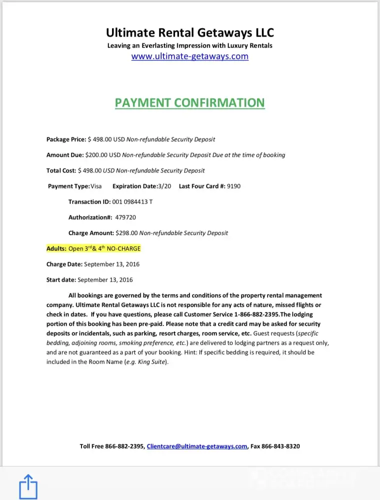 My name is Andrew McCarthy. I am the HR manager at Ultimate Rental Getaways LLC. I just checked our archives to find your purchase and was unsuccessful. I also noticed our company logo but we are not in Boca Raton, FL and that number listed is not our client care phone number. We are located in Wilton Manors, FL which is not even the same county and our client care number is [protected]. There are companies in Florida with similar names as ours and i have a feeling you have possibly made a travel contract with another company. I wish you the best with whoever that may be.