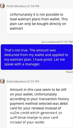 Next I do the online chat thing with their customer service, and they lie to me by telling me that I cannot use my wallet funds to pay for a Walmart plan. I reply back that I was asked to make a payment into my wallet so that I could use my wallet to pay for my plan (see the text above, asking me to make a payment of $$4.88 into my wallet), and that I have the proof.