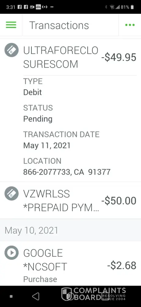 I was investigating a foreclosure and agreed to submit 1.00 for a one time offer to review foreclosures. I was debited from my debit account 39.40 3 days later (on 15 of the month) for the upcoming month. I contacted them and was charged 4.50 for usage in my state of AL. None of this was authorized and I cannot get any response from the company. I wrote them about my charges and they cancelled my account. I paid for the services and then was cancelled!I am not a happy camper and have no avenues to complain for a scam!