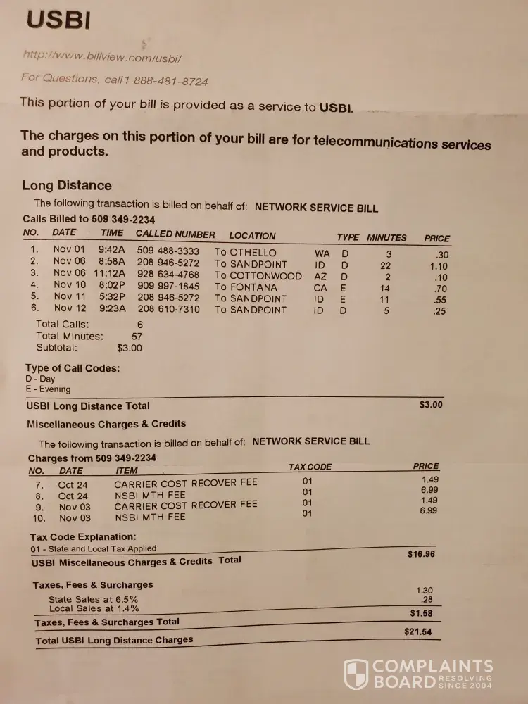 Read full complaint and 2 commentsUSB Network Carrier Service Charges added on to our Telephone Bill. for - usbi (third - party carrier/ telephone charges)