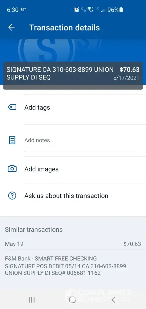 My debit card was charged $53.95, $50.00 for the deposit and $3.95. for the fee. I have a statement from the debit card account showing that amount was deducted and paid to Union Supply.