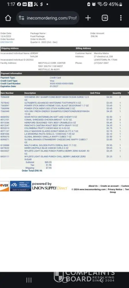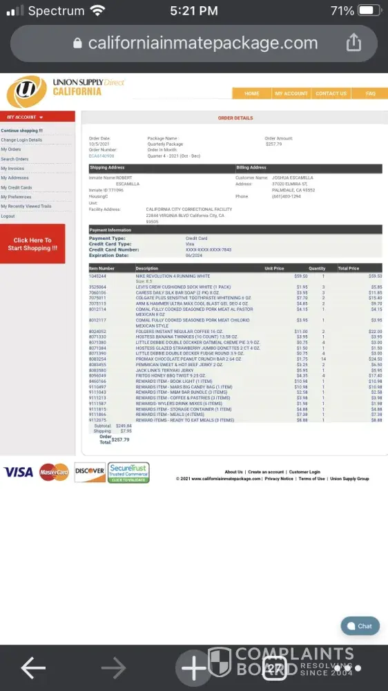 I have been purchasing inmate packages for a few years now via Union Supply Direct with no problems until recently. Apparently, they have a new computer system in place, and it has major computer clinches/ problems. It allows you to make purchases and the funds are immediately taken from your account. You receive the order confirmation and exactly seven days later your orders are canceled on their end not the customers.