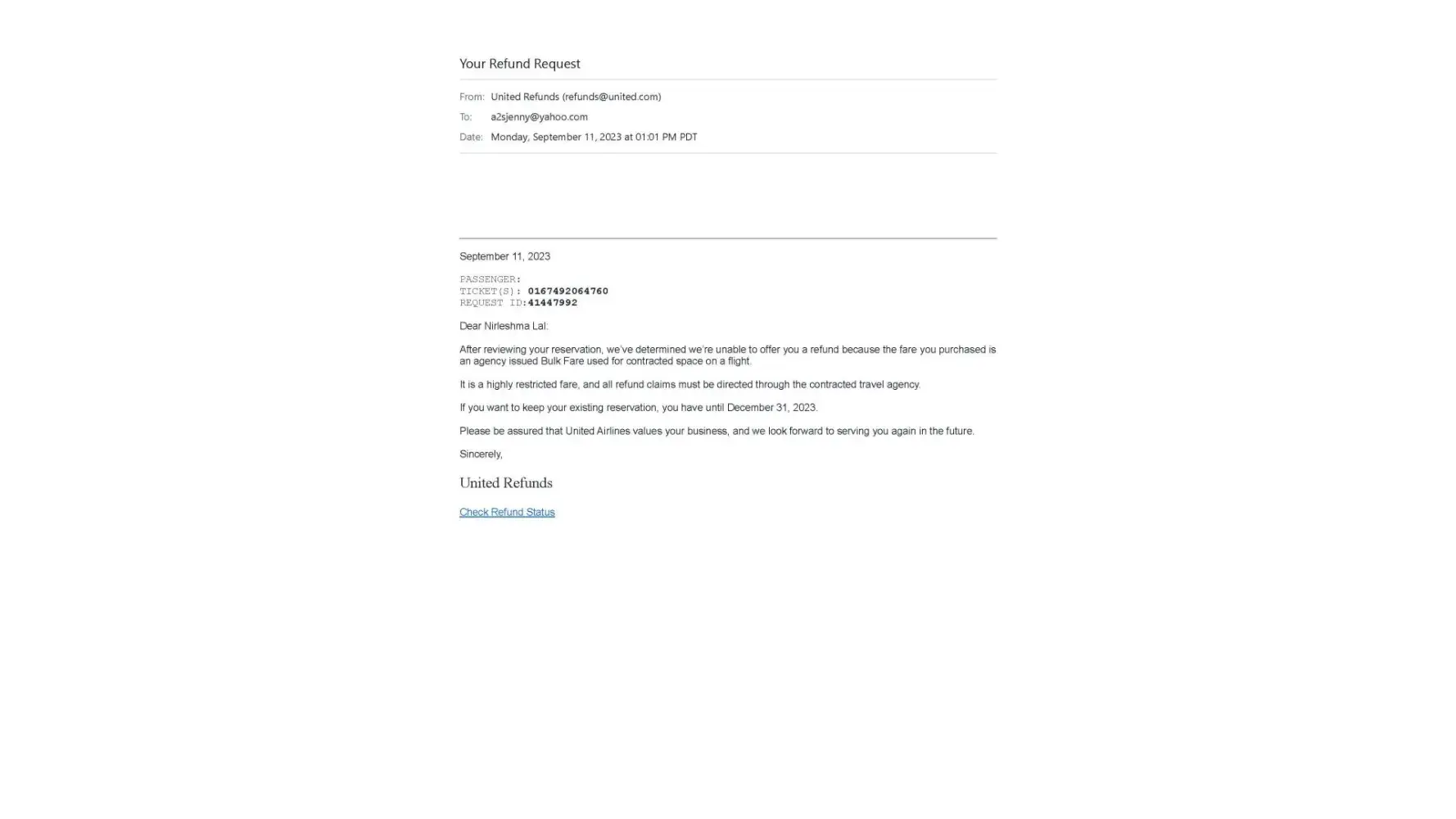 I am writing this to you in regards to my refund with united Airlines.