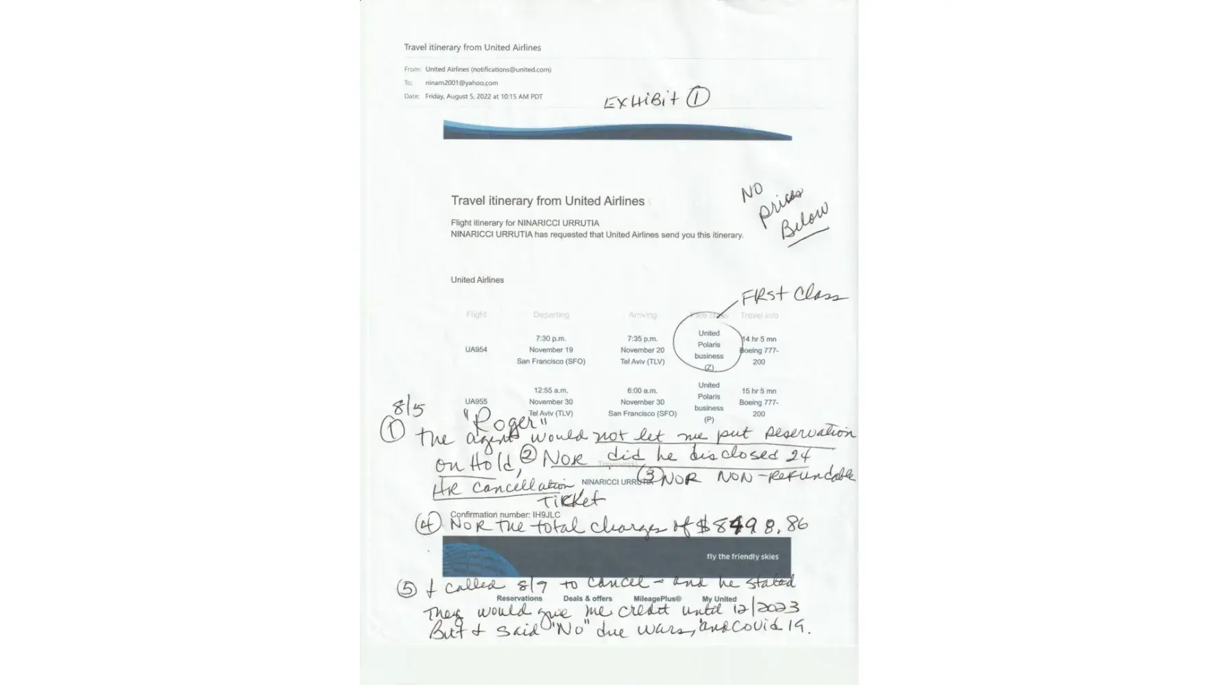 On August 5th, 2022, I made a reservation with "Roger" at United Airlines from San Francisco to Israel for a tour on 11/20/22-11/28/22. On August 6th I found out there was a war between the Palestinians and Israelites, inclusively Americans were killed and it was predicted it would last 3-6 months. On August 7th, I called United Airlines right away to cancel my reservation which I thought since it was in First Class that it was fully refundable only to find out that "Roger" was not honest when making my reservation. Roger did not disclose the ticket was NON-REFUNDABLE, nor did he disclose that I had 24-HOURS TO CANCEL, nor did he allow ME to place the RESERVATION ON HOLD, and fourthly, the charges were off was charged $8498.86 but only got a partial refund of 5396.93.