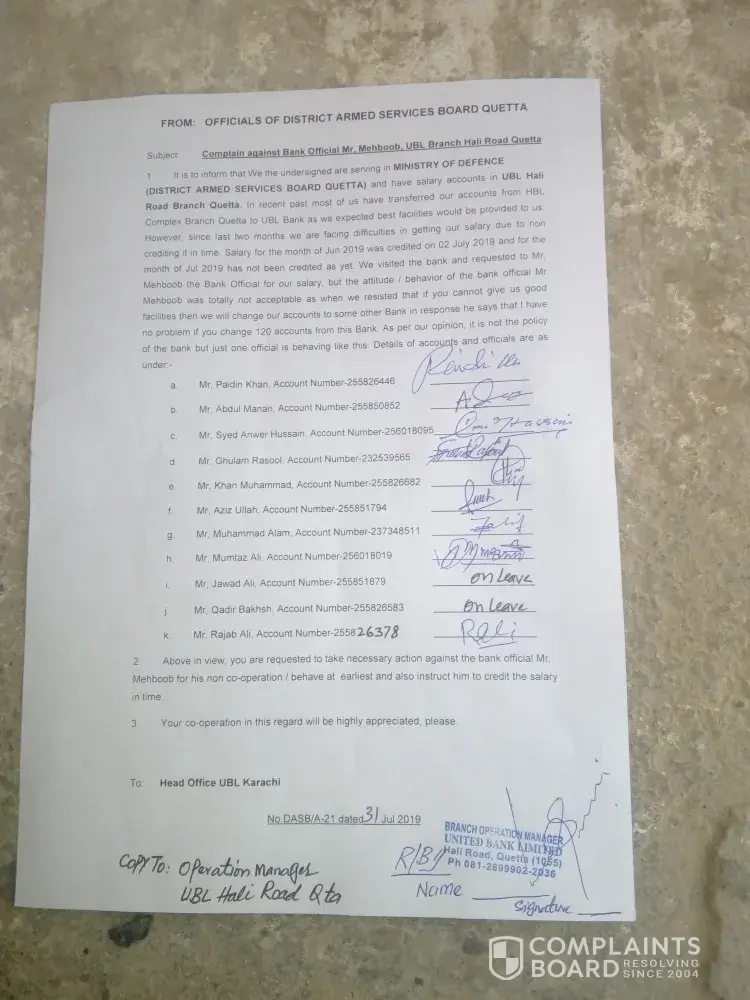 Sir, we are complaining against Mr Mehboob bank official UBL Hali road Quetta as his attitude is not acceptable, therefore it is requested to instruct him to facilitate the customer not to create problem