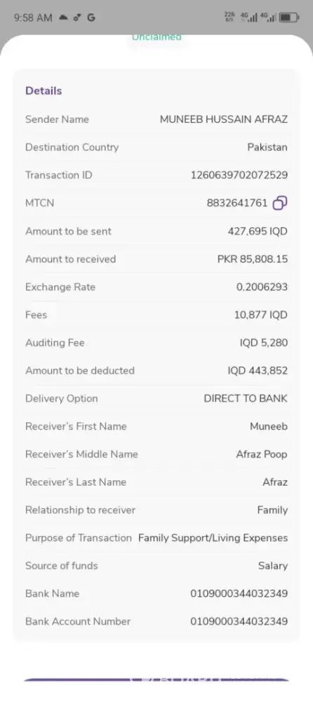 Rs.85,808 send from iraq on 4 march in pakistan