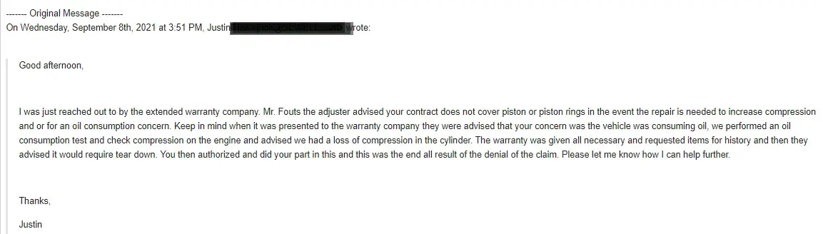 My Audi mechanic called United Car Care for me, stating that my engine was consuming oil and the compression in cylinder 3 was using 60% of my oil which is ultimately ruining my engine. The United Car Care adjuster/inspector told Audi that the engine would need to be torn down for him to see what was the cause of the fault. I emailed the person, [protected]@unitedcarcare.com, and he called me back stating the process of getting the claim approved is to tear down the engine. I authorized Audi to do this, because G. Fouts told me that was the only way to get the claim paid. After the engine was torn down, G. Fouts came back out, and almost instantaneously sent an email denying the claim, since it was a consumption claim. I contacted United Car Care and spoke with a person named Kevin. Kevin said "well the claim was denied because consumption is not covered, and the claim was presented to us as consumption" to which I asked "then why did your adjuster insist I tear down the engine then if he already knew it was consumption and that consumption is not covered?" That was on 9-8-21 at 4:04 pm and I was advised I would get a return call. So I have spent over $4000.00 on a warranty, which I have never filed a claim until now, and it is immediately denied after they cause me to have to pay $5200.00 for a tear down of my engine so they can knowingly deny the claim due to uncovered consumption claim. The worst, and this was purchased through Endurance Warranty, with the insurance being Mepco. A COMPLETE scam and waste of 9000.00.
