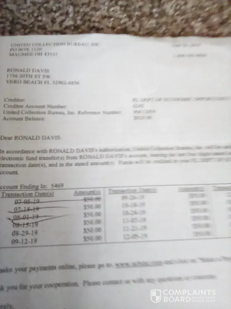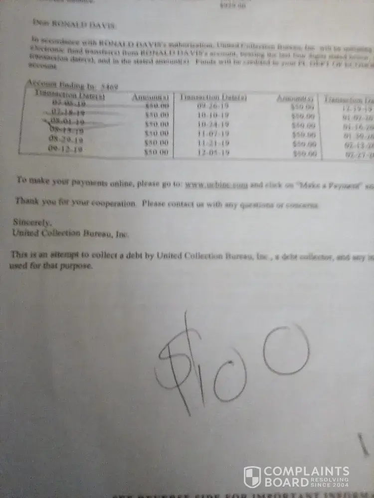 United Collection Bureau [UCB] complaints: history and resolution overview