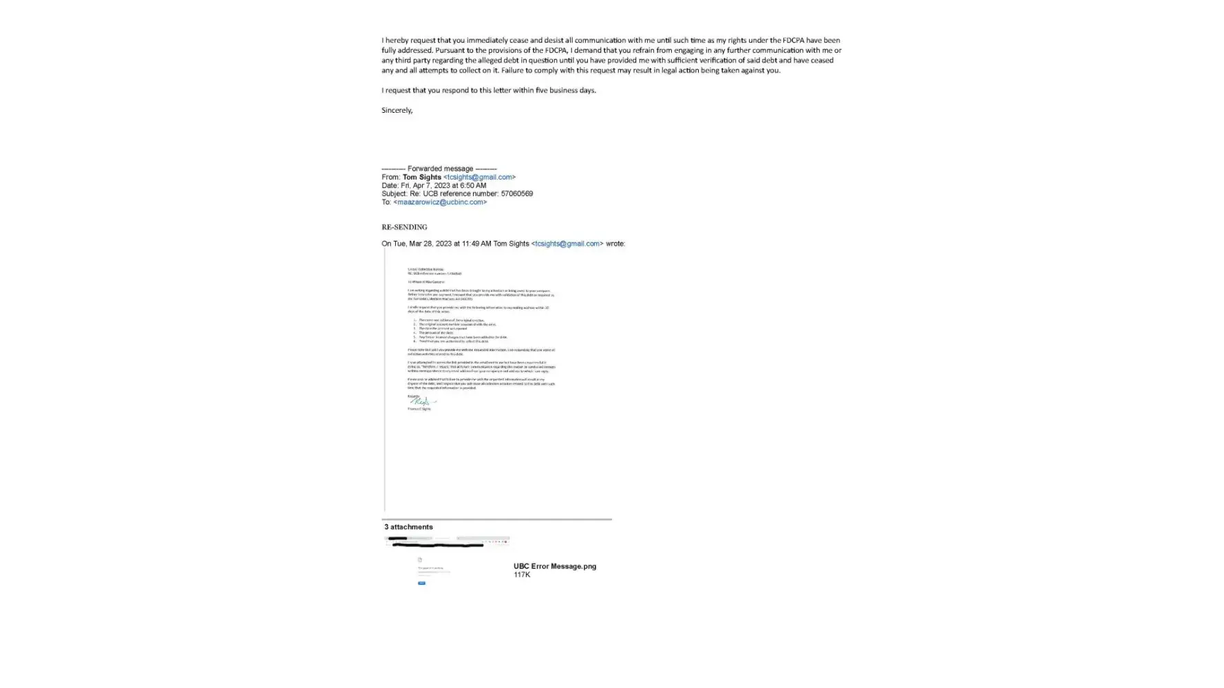 In addition, I find it particularly concerning that UCB continues to send me emails requesting that I contact them, while ignoring my attempts to communicate with them. This lack of communication has caused me great inconvenience and distress.