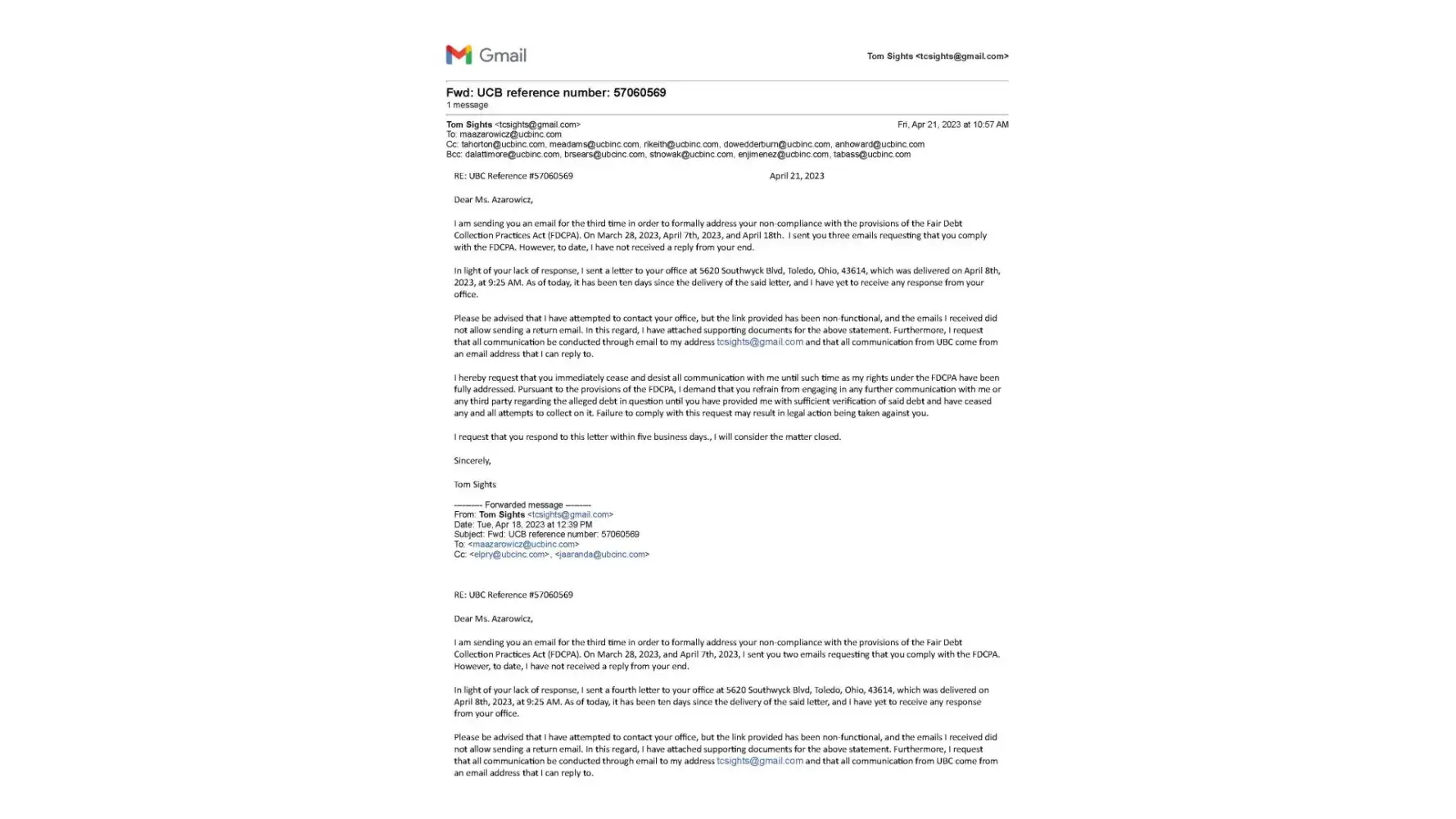 I am writing to file a complaint against United Collection Bureau, Inc. regarding their failure to acknowledge and respond to my repeated attempts to contact them since March 2023. Despite sending several letters March 30thand April 8th directly to their offices and emails to Ms. Maria Azarowicz on March 28th, April 18th and again on April 20th & 21st. I have not received any response from Ms. Azarowicz or anyone else from UCB, which is unacceptable and unprofessional.