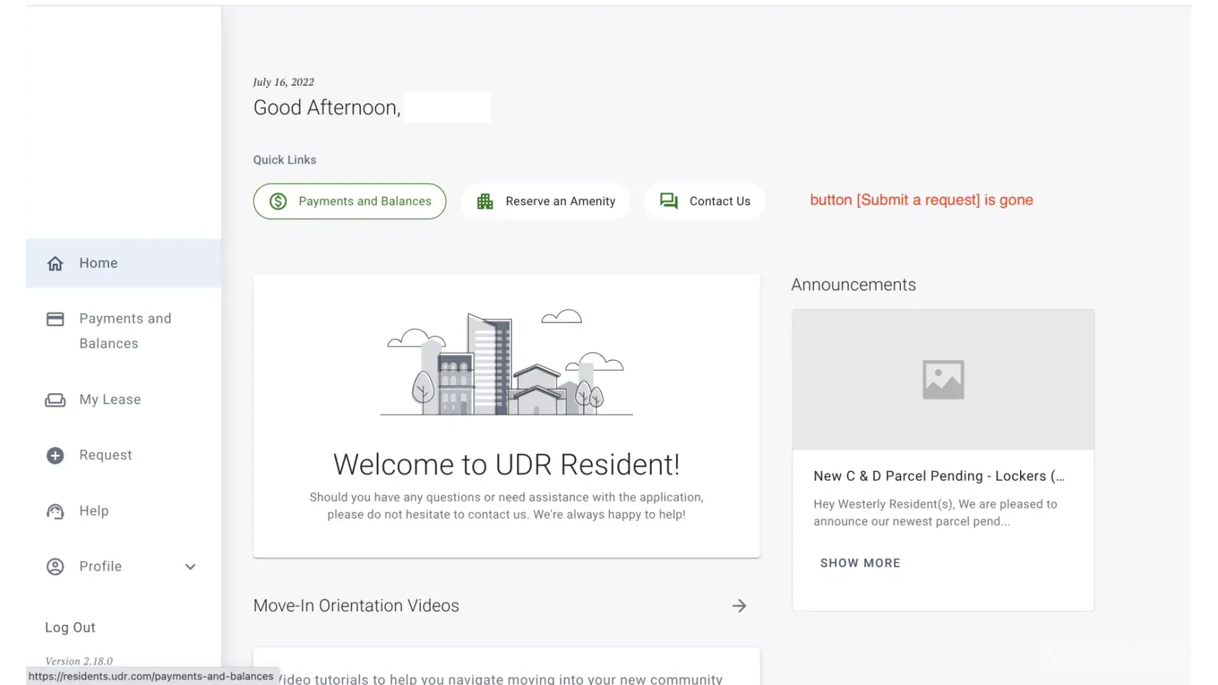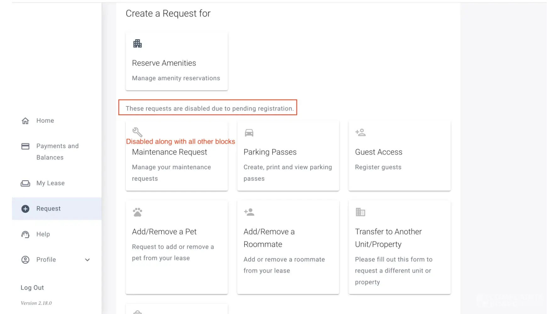 Starting on 7/16/2022, both mobile app (version 2.16.0) and web end (version 2.18.0, see attached pictures) lock all request blocks. I cannot even submit a maintenance request, reserve any amenities or request any changes to my apartment.