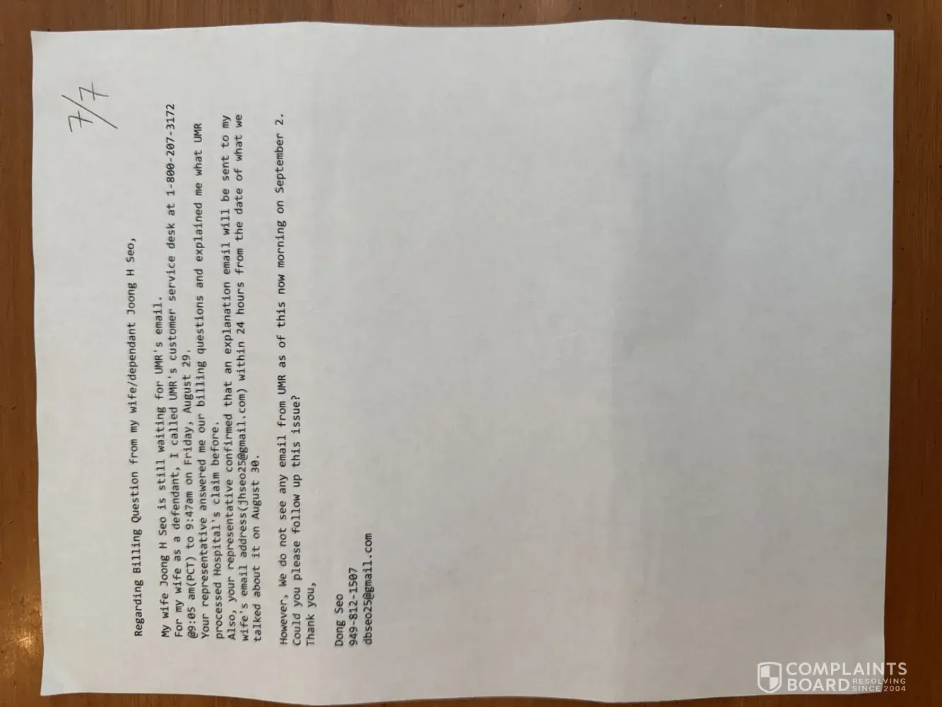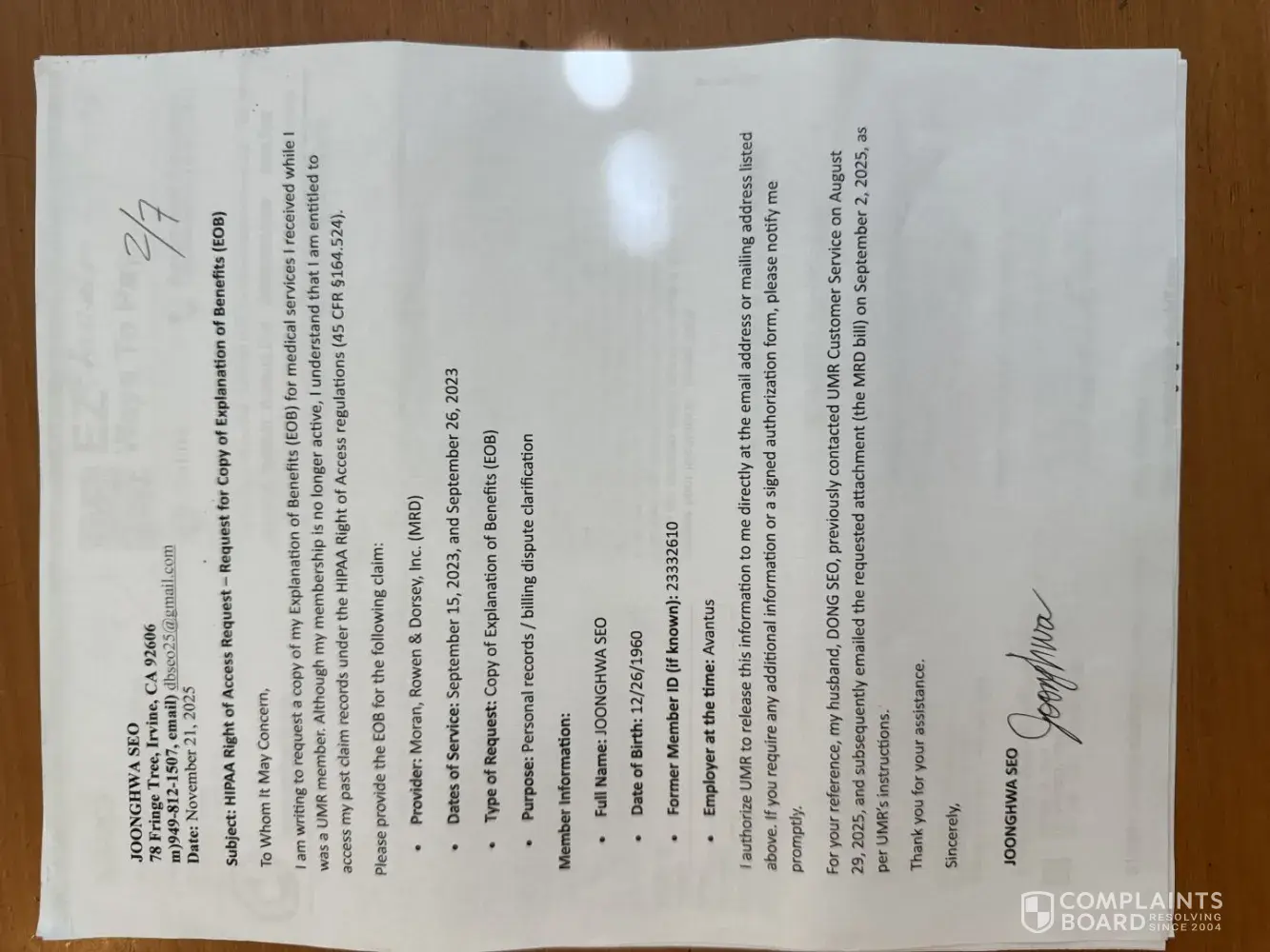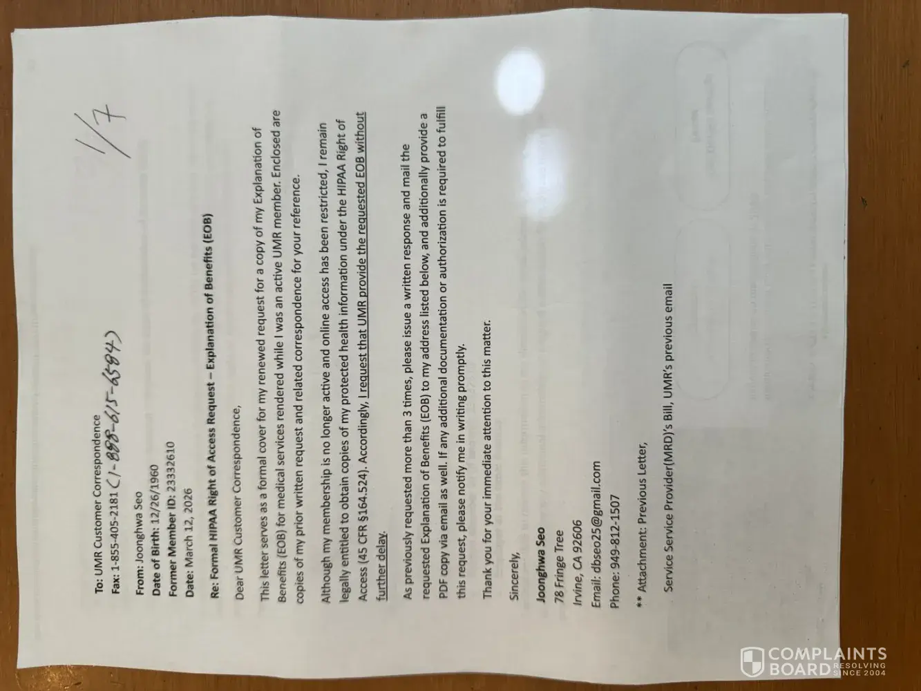 To: UnitedHealthcare Corporate Complaint From: Joonghwa Seo Date of Birth: 12/26/1960 Former Member ID on UMR: [protected] Date: April 8, 2026 Re: Formal HIPAA Right of Access Request – Explanation of Benefits (EOB) This is a formal complaint regarding UMR’s failure to provide my EOB despite multiple requests. I am a former member requesting record...