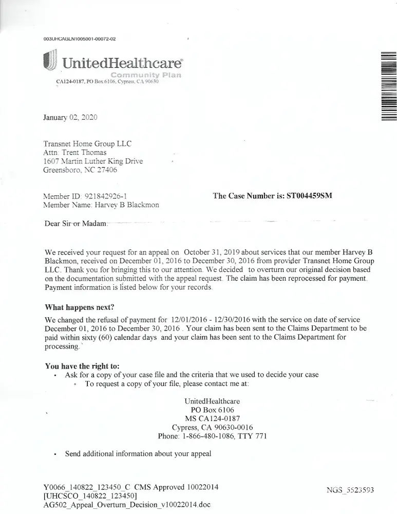 It has been over three years since services were provided and I am still awaiting payment even after several appeals overturning the original denial and promising payment within 60 days its been over 6 months since receiving these letters and still no payment. When I call I get consistently transferred over and over. I then get sent to another appeals process even though one was successfully completed on the exact same claims and again letters promising to pay within 60 days with no payment. I have all the letters from uhc with corresponding case numbers. My company name is Transnet Home Group business lic # [protected]. My name is Trent Thomas and I can be reached at [protected]