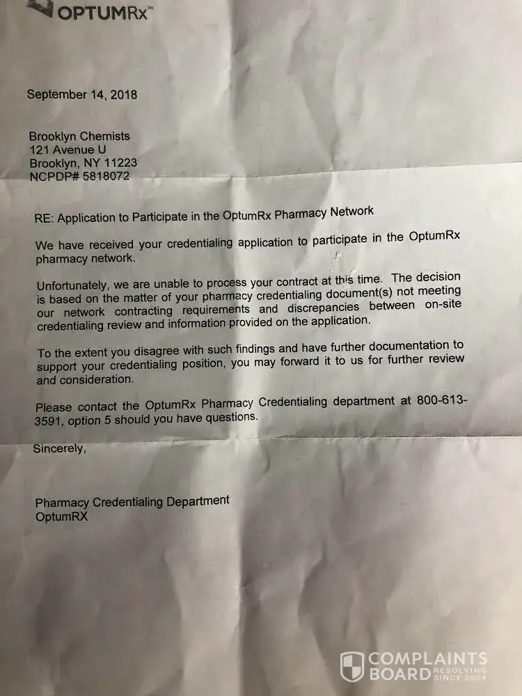 After requesting an application for my pharmacy to enroll with Optum Rx which is the prescription carrier for UHC, this is the letter we finally received. Regardless of how well my pharmacy satisfied all of their requirements and protocol, I was told that nothing else was needed and to just wait for an answer. Of course they still rejected my pharmacy, without giving any specific reason. In the letter they mention that I may send further documentation to dispute this decision. How is this possible when there is no basis provided. And the phone number for any questions I have isn't even a working number, just a recording that asks for a mailbox number and then cuts off. When I finally found the UHC contract specialists who can help answer what the discrepancies were, there was never any answer or any response to my messages. So for all you independent pharmacies out there who plan to apply with this corrupt enterprise, make sure to hire a lawyer.