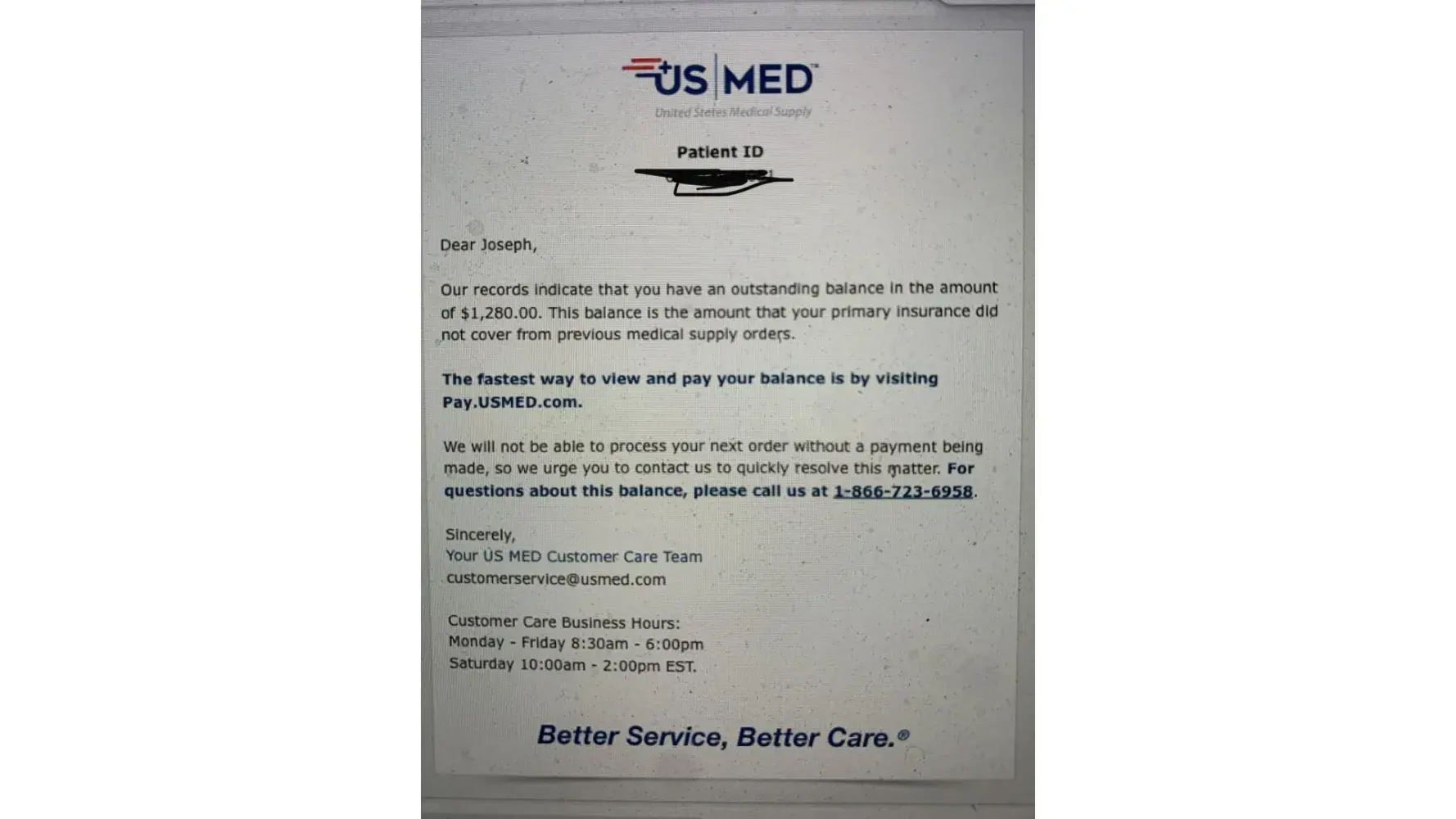 Via speaker phone each time: In February a USMED, LLC customer service representative verbally stated to my wife and myself that the FreeStyle Libre 14-day monitoring system is covered at 100% by our Medicare Advantage Insurance. I accepted the system in March, and began receiving numerous bills for the March supplies. Each billing invoice had a higher balance for the same items and date of service. My wife and I telephoned USMED in an effort to clarify and rectify the billing issues. When we telephoned customer service we were put on hold and forgotten, or disconnected on numerous occasions. When we were finally able to reach customer service, we were told that the initial information we were provided was wrong and that the system was covered at a lower rate than the company initially thought and it was actually $29.99 a month per person. We then received an even higher *** and were told by customer service that that the sensor is not considered a diabetic supply and therefore not covered. We cancelled the FreeStyle Libre 14-day system and paid the balance in full on *** 9, 2019. I returned the next shipment with a label provided by USMED, LLC. Despite our repeated calls to USMED, LLC customer service, email correspondence with Ms., Team Leader Quality Assistance whom we provided with proof of payment and responded that the returned items had been received and would be credited to our account bills continue to arrive without our payment or the returned supplies credited to our account. In February My wife submitted a letter to the corporate office with proof of payment as well. I am still receiving bills for the paid balance and the returned supplies on a semi-monthly basis. I am providing copies of the most recent ***, letters sent to USMED/USMED corporate office as well as the email correspondence with Ms. Product_Or_Service: FreeStyle Libre 14-day continuous monitoring syste Account_Number: USM XX XXXXX