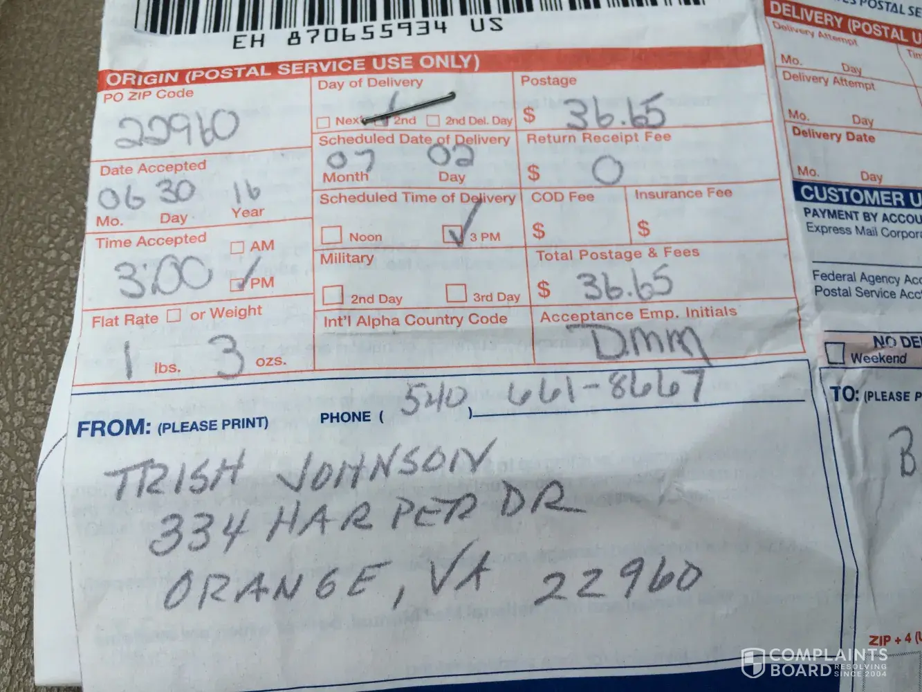6-30-16 Express Package Mailed to me from Orange, VA to Lawton, OK with promised delivery of 7-2-16.