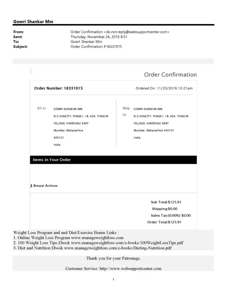 Hi, I have ordered breast active product from breastactive official website and i got mail confirmation from websupportcenter.com on 24-11-2016 and got shipping details confirmation on 30-11-2016. details as below