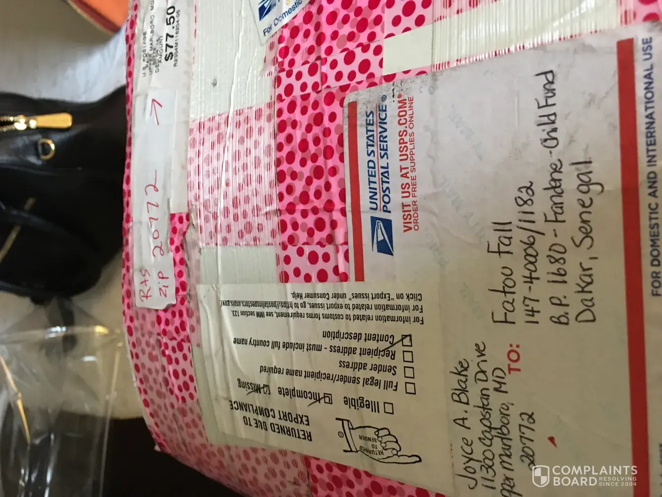 I sent a package from the Upper Marlboro, MD office to Dakar, Senegal. The package was sent on December 4, 2015. It was returned to me in January 2017. The only thing that the note on the box says it was missing the content description. The receipt that I have shows where I filled out the contents in the box. It cost me $77.50 to send this package. I feel that the Post Office should resend the package at their cost. I filled out the Customs Declaration and Dispatch Note - CP 72.