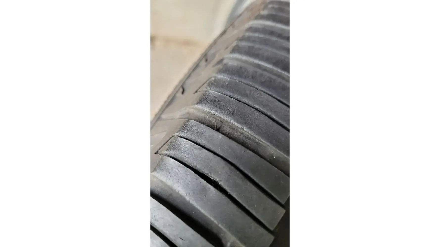 Upon inspecting the tires, I noticed some issues. One of the tires has a metal piece attached to it, and another tire seems to have been patched at the edge, which, as per my understanding, is not a repairable part of the tire. I have attached pictures for your reference.