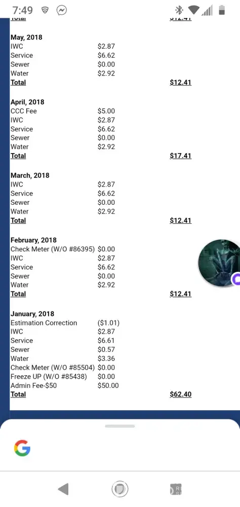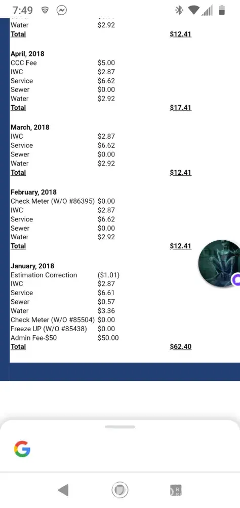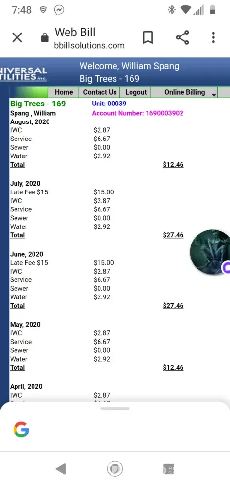 Universal utilities are so inconsistent with their billing that it's not funny my sister-in-law lives in the same park she has a different charge than I do and she has more charges has service charge a maintenance charge administrative charge she pays more charges than she does are actually water and sewage bill then my sewage bill is higher than my water bill makes no sense just put the meter in my water line not the parks water line
