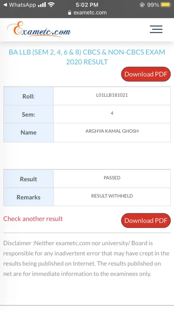 This is to inform you that I Arghya Kamal Ghosh, a student of Department of Law, Calcutta University, Registration No- L01-[protected] and Roll No- L01-LLB-181021. Now I am in my 5th semester. Today(22.02.2021) the result of 4th semester is out online. But my result is not showing.